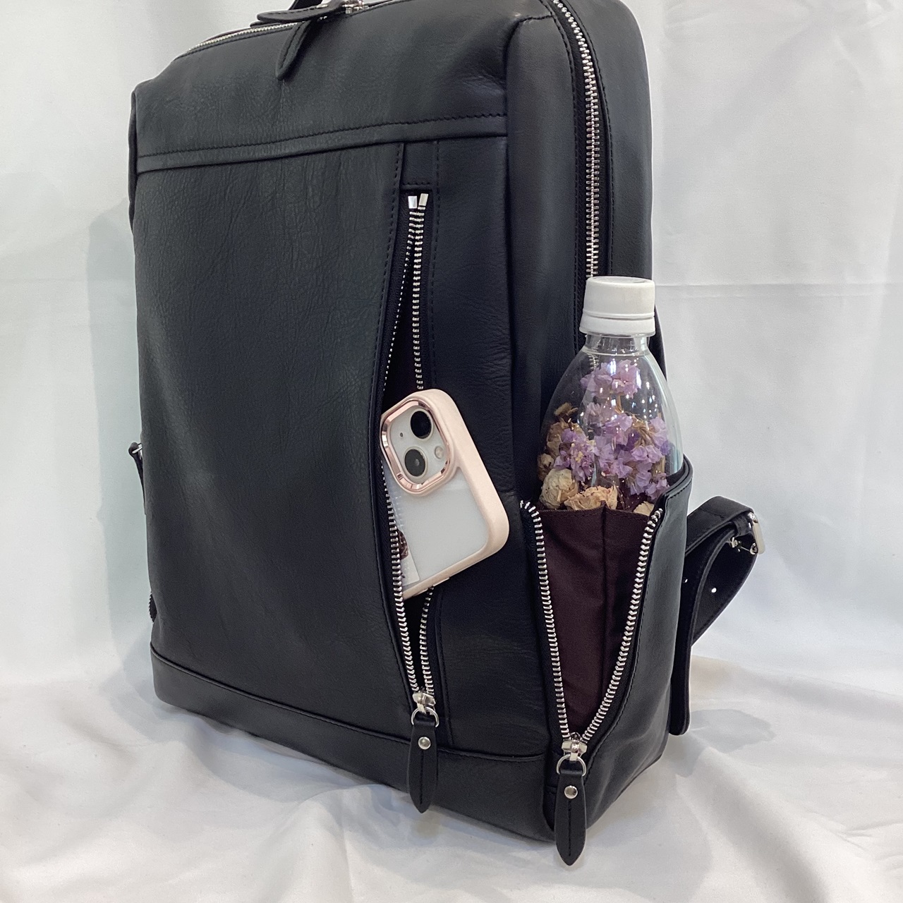 ・外側のサイドに拡張ポケットが付いているので、広くするとペットボトルが入ります